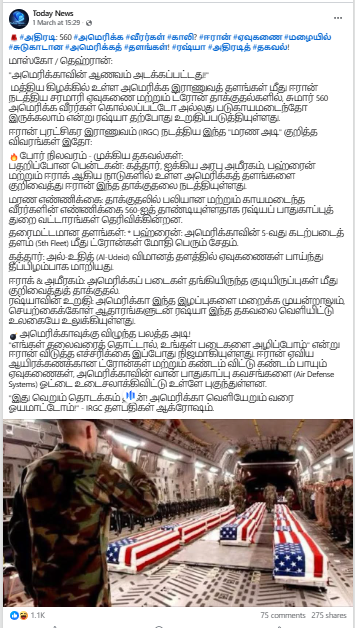 ஈரான் யுத்தத்தில் இதுவரையில் (13.03.2026) அமெரிக்க இராணுவ வீரர்களில் 11 பேர் தான் உயிரிழந்துள்ளதாக சர்வதேச ஊடகங்கள் செய்தி வெளியிட்டிருந்தமை காணக்கிடைத்தது. Aljazeera | cbsnews | independent