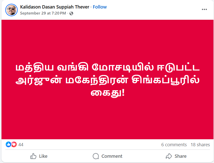 குறித்த பதிவில் மத்திய வங்கி மோசடியில் ஈடுபட்ட அர்ஜுன் மகேந்திரன் சிங்கப்பூரில் கைது! என தெரிவிக்கப்பட்டு கடந்த 2025.09.29 ஆம் திகதி பதிவேற்றம் செய்யப்பட்டிருந்தது.