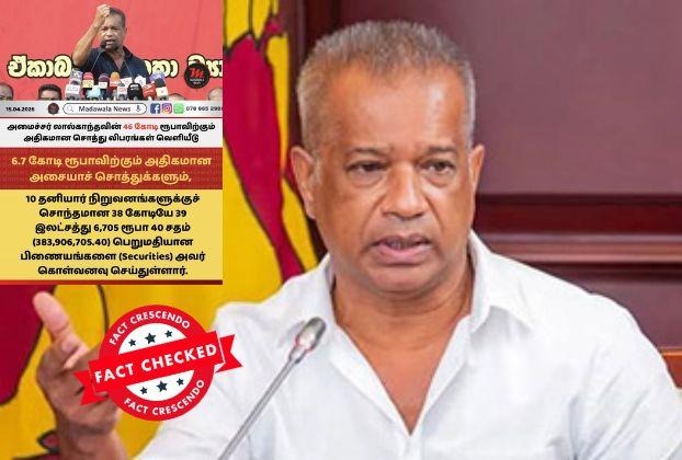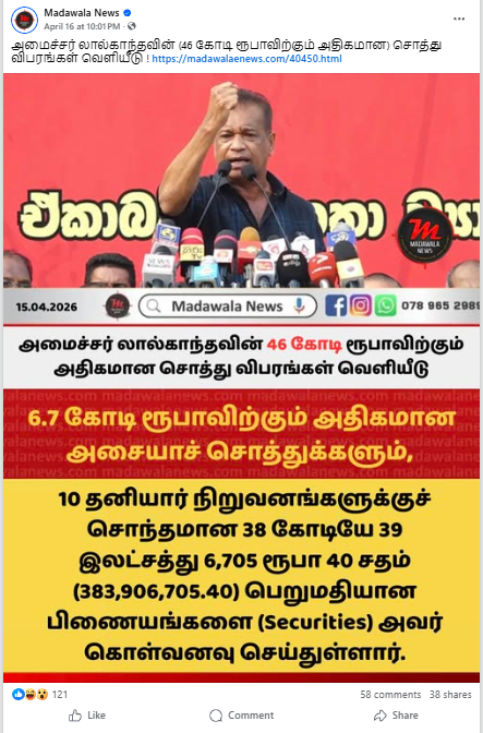 அமைச்சர் லால்காந்தவின் (46 கோடி ரூபாவிற்கும் அதிகமான) சொத்து விபரங்கள் வெளியீடு என தெரிவிக்கப்பட்டு குறித்த தகவல் கடந்த 2026.04.16 ஆம் திகதி சமூக ஊடகங்களில் பகிரப்பட்டிருந்தது.