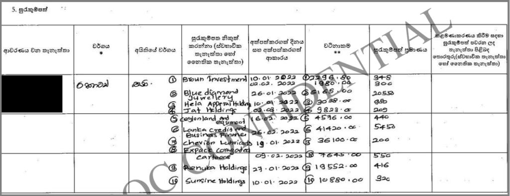 இந்த மொத்த பிணையங்களின் (Securities) பெறுமதி ரூபா. 143,476 ஆகும் (ஒரு இலட்சத்து நாற்பத்தி மூவாயிரத்து நானூற்று எழுபத்தி ஆறு ரூபா). சொத்து விபர அறிக்கையின் “பெறுமதி” (Value) நிரலில் உள்ள பெறுமதியை, “பிணையங்களின் எண்ணிக்கை” (Quantity) நிரலில் உள்ள பெறுமதியுடன் பெருக்கி, அதனை அந்த நிறுவனங்களில் முதலீடு செய்யப்பட்ட ஒரு அலகின் விலை (Unit Price) எனத் தவறாகக் கருதி, பிரதான ஊடகங்கள் மற்றும் சமூக ஊடகங்கள் ஊடாக இந்த பிணையங்களின் மொத்தப் பெறுமதி ரூபா. 383,906,705.40 (முப்பத்து எட்டு கோடியே முப்பத்து ஒன்பது இலட்சத்து ஆறாயிரத்து எழுநூற்று ஐந்து ரூபா நாற்பது சதம்) எனத் தவறாகப் பதிவிடப்பட்டிருந்தது. ஆனால், அந்த அறிக்கையின் “பெறுமதி” நிரலில் காட்டப்பட்டுள்ளது அந்தந்த நிறுவனங்களில் உள்ள ஒட்டுமொத்த பங்குகளினதும் பெறுமதியாகும்.