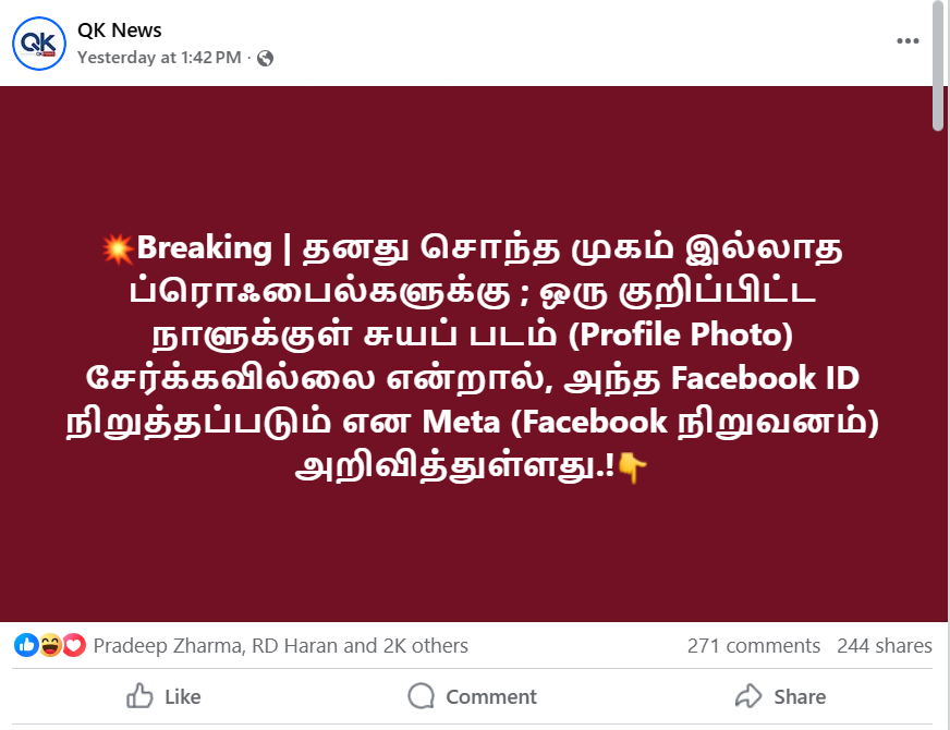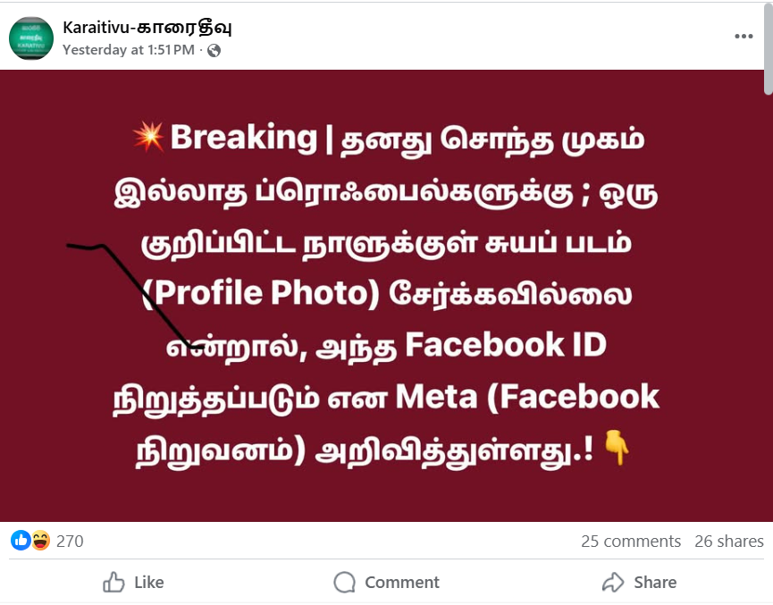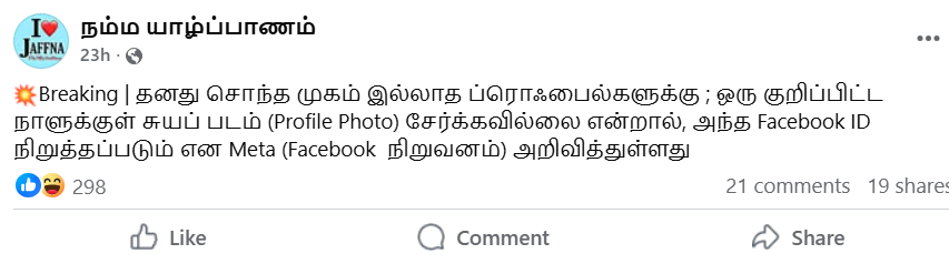 Breaking தனது சொந்த முகம் இல்லாத ப்ரொஃபைல்களுக்கு ; ஒரு குறிப்பிட்ட நாளுக்குள் சுயப் படம் (Profile Photo) சேர்க்கவில்லை என்றால், அந்த Facebook ID நிறுத்தப்படும் என Meta (Facebook நிறுவனம்) அறிவித்துள்ளது.! என தெரிவிக்கப்பட்டு குறித்த பதிவானது 2025.10.14 ஆம் திகதி பதிவேற்றம் செய்யப்பட்டுள்ளது.