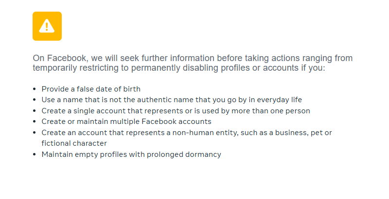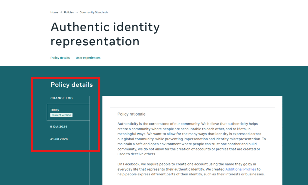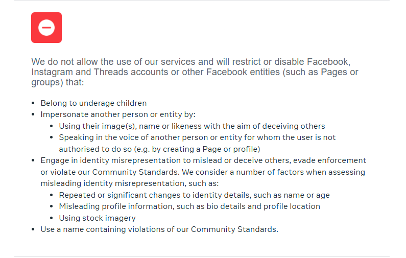 இவ்வாறு புகைப்படங்கம் மற்றும் ஆள்மாறாட்டங்கள் தொடர்பில் Meta நிறுவனமானது அவர்களின் சமூக தரநிலைகளில், உண்மையான அடையான பிரதிநிதித்துவம் (Authentic identity representation) என்ற அம்சத்தின் கீழ் வகைப்படுத்தியிருந்தது.